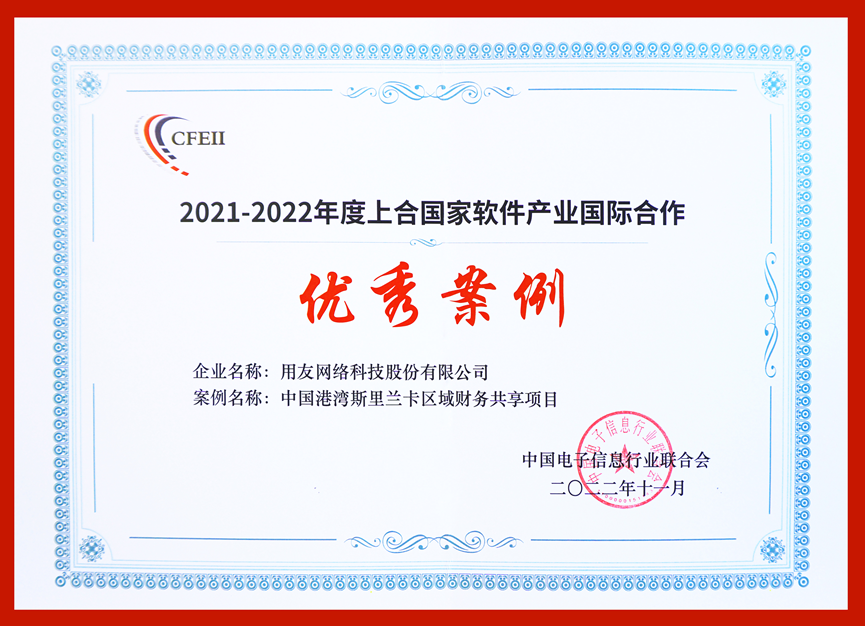 用友軟件承接的中國港灣斯里蘭卡區(qū)域財務(wù)共享項(xiàng)目,獲評“2021-2022年度上合國家軟件產(chǎn)業(yè)國際合作優(yōu)秀案例“。