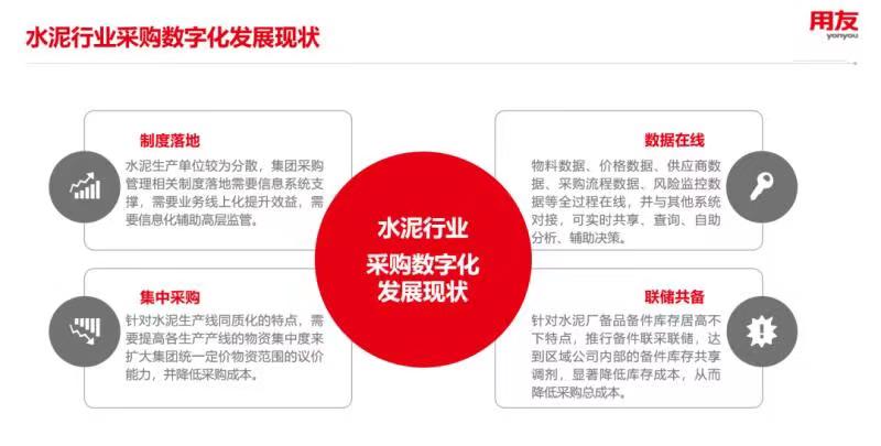 用友以企業(yè)采購數(shù)智化變革研究為基礎(chǔ),針對(duì)水泥行業(yè)進(jìn)行專項(xiàng)分析,發(fā)布用友BIP水泥行業(yè)采購及供應(yīng)鏈解決方案。