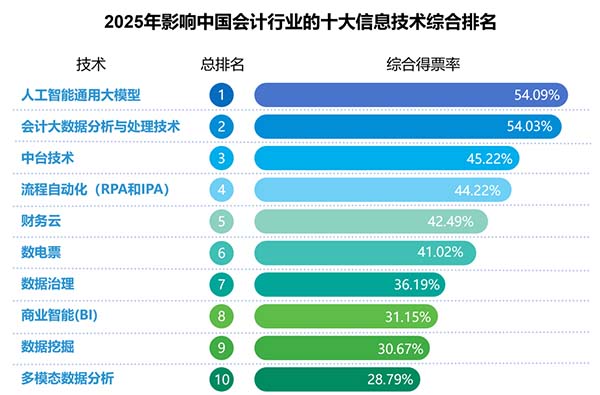 以往評(píng)選結(jié)果相對(duì)穩(wěn)定,今年卻發(fā)生顯著變化,人工智能通用大模型、多模態(tài)數(shù)據(jù)分析都是第一次出現(xiàn)在榜單中。同時(shí),新一代ERP(曾連續(xù)5年入選)、電子會(huì)計(jì)檔案(曾連續(xù)8年入選)則退出了榜單。新興技術(shù)以顛覆性姿態(tài)加入,傳統(tǒng)熱門(mén)技術(shù)逐漸淡出,這表明會(huì)計(jì)科技正處于快速變革的關(guān)鍵節(jié)點(diǎn)。