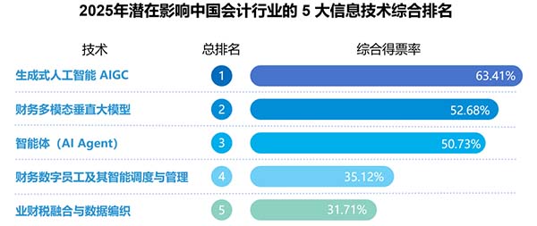 近日,上海國(guó)家會(huì)計(jì)學(xué)院發(fā)布的“2025年影響中國(guó)會(huì)計(jì)行業(yè)的十大信息技術(shù)”評(píng)選結(jié)果中,人工智能通用大模型第一次上榜便以“黑馬”之姿登頂,釋放出強(qiáng)烈的行業(yè)信號(hào)。隨著以DeepSeek等為代表的 AI 大模型技術(shù)不斷成熟與深入應(yīng)用,會(huì)計(jì)工作的流程與模式正在被重新定義,AI 正成為驅(qū)動(dòng)會(huì)計(jì)行業(yè)發(fā)展的新引擎。