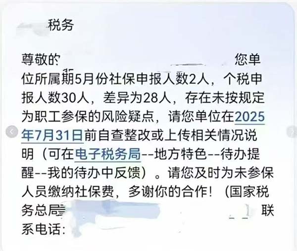 您單位所屬期5月份社保申報人數(shù)2人,個稅申報人數(shù)30人,差異28人,存在未按規(guī)定為職工參保的風險疑點,請您單位在2025年7月31日前自查整改或上傳相關情況說明。請您及時為參保人員繳納社保費,多謝你的合作!”